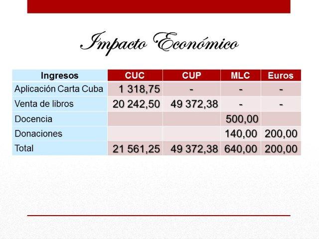 Y en medio de todo, hubo que encarar la inscripción de nuestros tres proyectos de investigación en el Programa Nacional de Ciencias Sociales y Humanísticas del CITMA, tarea cumplida satisfactoriamente, en tiempo récord, y sin experiencia previa al respecto de ninguno de los implicados. Con ello se cumple una disposición legal, pendiente en el CEM desde hace muchos años, pero que rige la actividad científica en el país desde hace más de una década. Además, se garantiza así una remuneración superior a cada uno de los implicados en los proyectos, lo cual significa, al mismo tiempo, un estímulo y una mejora material de las condiciones de vida de nuestros profesionales. Debemos mencionar también, que aunque por razones obvias el nivel de ingreso no se iguala al de años anteriores, pudimos aportar en este período en los siguientes rubros: