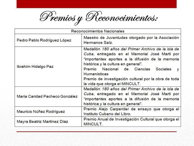Es justo entonces que mencionemos aquí los premios obtenidos por el CEM en este período, 5 Premio Colectivo Orden ―Carlos J. Finlay‖, Academia de Ciencias de Cuba. Reconocimientos Nacionales Pedro Pablo Rodríguez López Maestro de Juventudes otorgado por la Asociación Hermanos Saíz. Ibrahím Hidalgo Paz Medallón 180 años del Primer Archivo de la isla de Cuba, entregado en el Memorial José Martí por ―importantes aportes a la difusión de la memoria histórica y la cultura en general‖. Premio Nacional de Ciencias Sociales y Humanísticas Premio de investigación cultural por la obra de toda la vida que otorga el MINCULT. María Caridad Pacheco González Medallón 180 años del Primer Archivo de la isla de Cuba, entregado en el Memorial José Martí por ―importantes aportes a la difusión de la memoria histórica y la cultura en general‖. Mauricio Núñez Rodríguez Premio Alejo Carpentier de ensayo que otorga el Instituto Cubano del Libro.