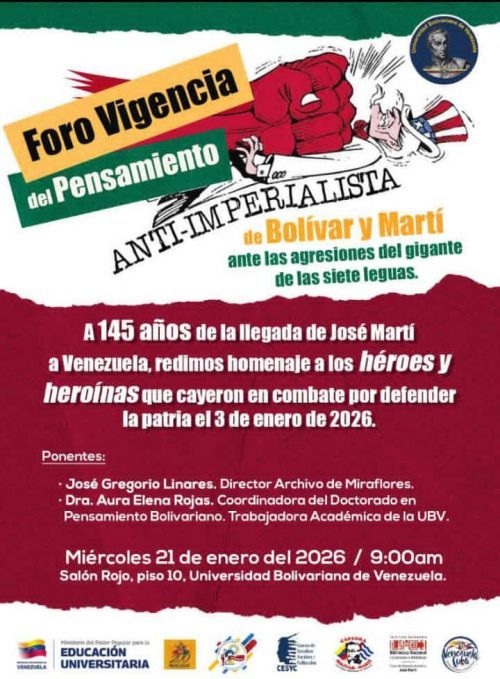 Videos y textos del Centro de Estudios Martianos fueron compartidos en el Foro Vigencia del pensamiento antimperialista de Bolívar y Martí, organizado este miércoles 21 de enero, en el Salón Rojo de la Universidad Bolivariana de Venezuela (UBV), donde fue recordado el aniversario 145 de la llegada del prócer cubano a Caracas.